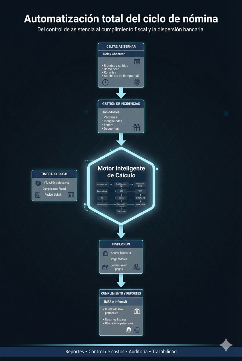 Calcula, timbra y dispersa nómina con integración biométrica y cumplimiento SAT, IMSS e INFONAVIT. Todo en una sola plataforma.