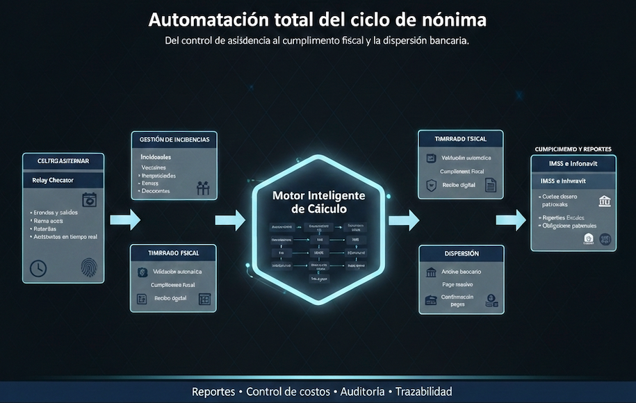 De la asistencia a las incidencias, del cálculo al timbrado CFDI 4.0 y dispersión automatica con cumplimiento y visibilidad para cada área.