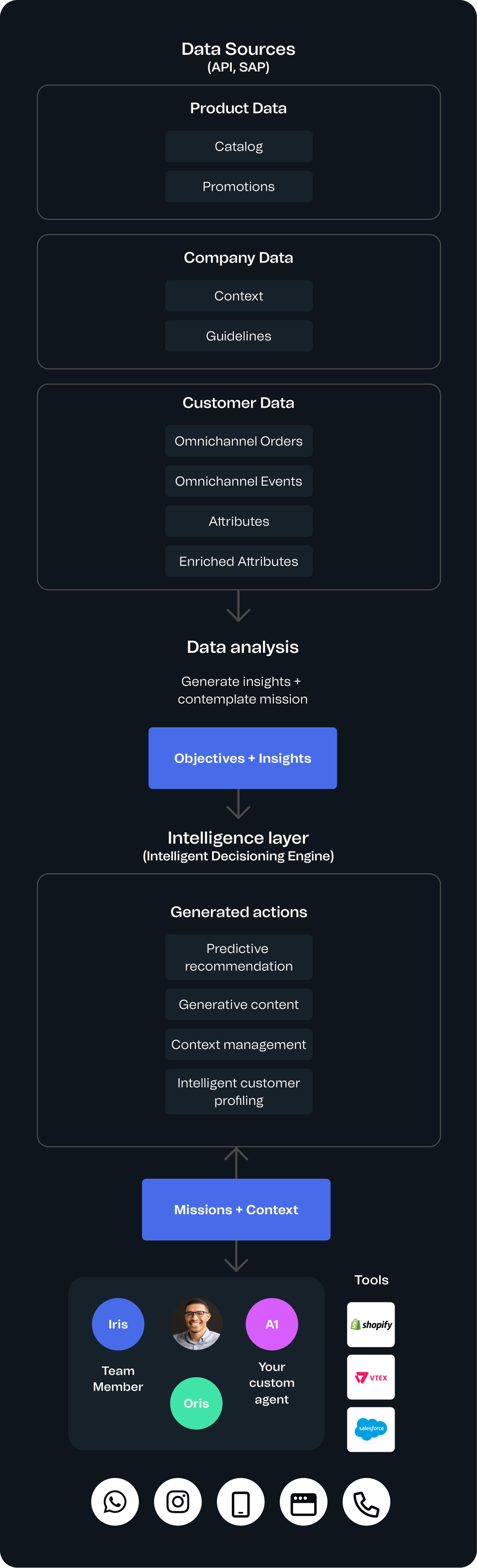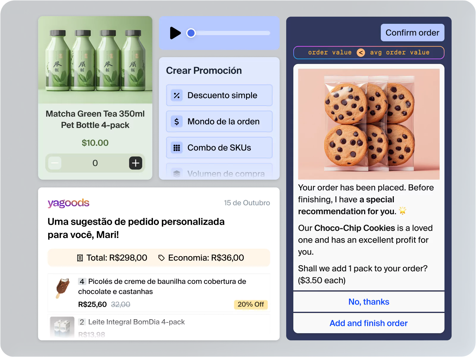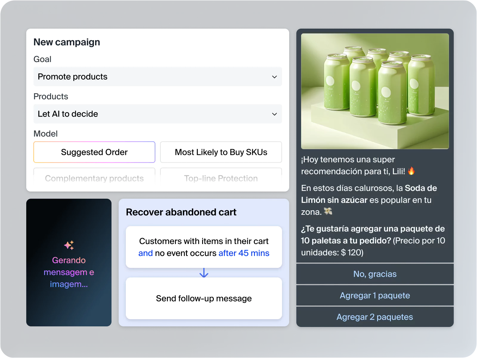 Convierte cada interacción en una venta con inteligencia.Recomienda productos, optimiza promociones y gestiona catálogos y carritos de manera inteligente y personalizada, para una experiencia de compra ágil y sin fricción en todos los canales.
